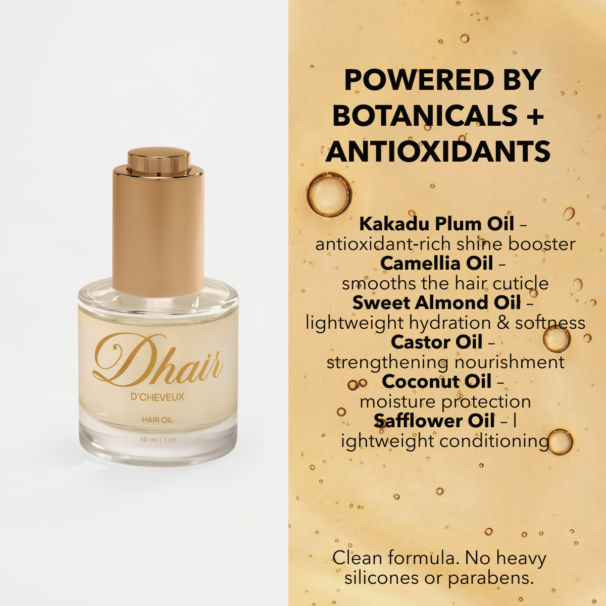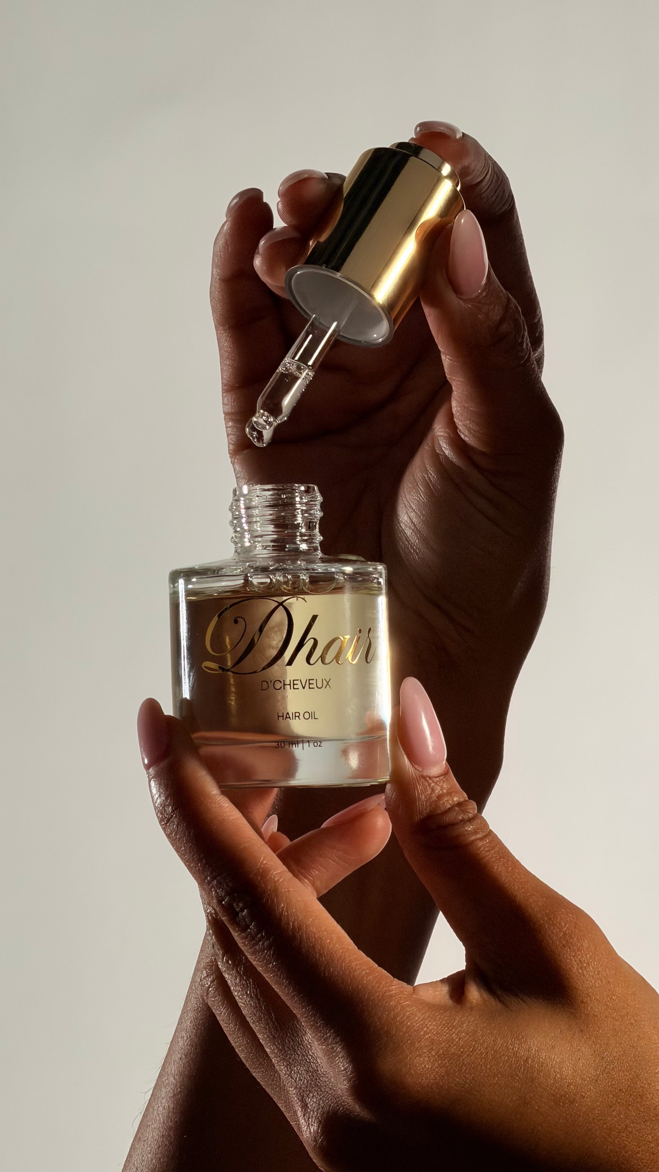 D’Cheveux Hair Oil is a lightweight, luxury oil designed to maintain the beauty of your hair and extensions. Our formula restores softness, seals in moisture, and leaves hair with a luminous finish—without weighing strands down or collapsing volume.